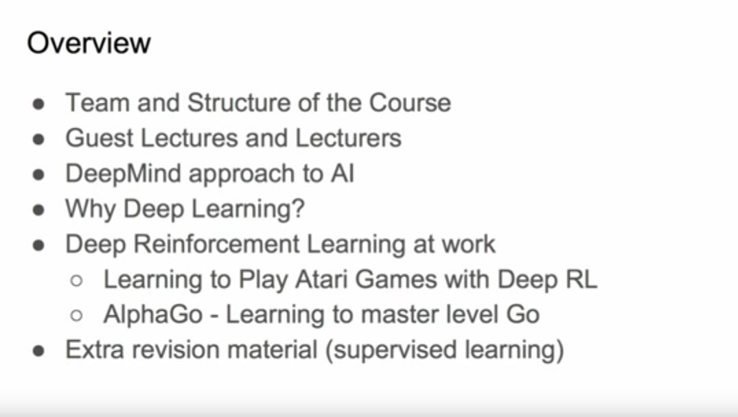 从第一课来看,本课程将讲解 DeepMind 的 AI 方法,深度强化学习在雅达利、AIphaGo 等游戏中的应用。