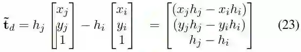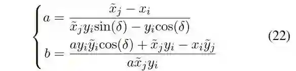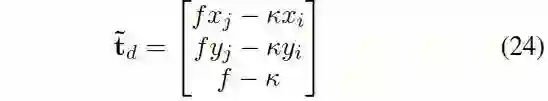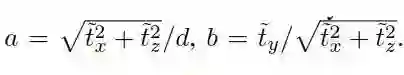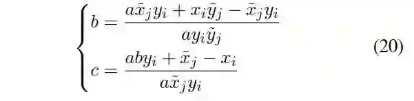 假定a=ty/d是通过离散采样得到,2个未知参数为b=tx/ty,c=tz/ty。已知一个a以后,只需要一对匹配点得到b,c。从方程(15)得到: