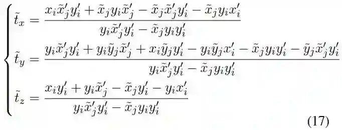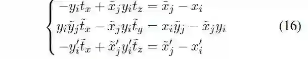 实际上方程组只有2个独立参数,因为反对称矩阵的秩为2,因此需要增加一个方程,则需要再增加第二个关联点,从(15)中任选一个即可: