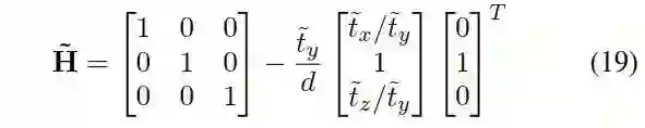 利用处于y轴法平面的无穷远点求解上面的方程组,而这些点其实都在水平面上,所以y坐标(像素坐标乘以反标定矩阵)等于0,则(7)(9)都为0。所以得到有: