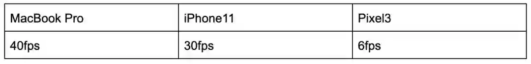 Handpose 是相对轻量级的包,大约占 12MB 的空间,适合用于实时推理。下表显示该软件包在不同设备中的性能: