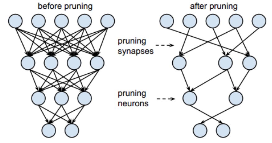 网络剪枝主要通过移除冗余的权重来实现网络的压缩和加速。比如用奇异值分解(SVD)全连接层的权重矩阵、去除预训练中的部分权重、将filter变换到频域避免浮点计算。还有的通过去除冗余的filter、或者对channel进行选择这样冗余filter/channel后续的计算就无需考虑了。