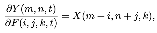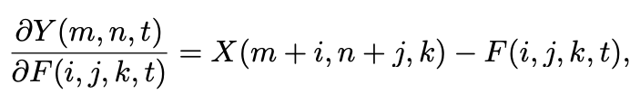 神经网络利用反向传播来计算滤波器的梯度和随机梯度下降来更新参数。在CNN中,输出特征Y相对于滤波器F的偏导数被计算为: