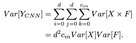 在传统的CNN中,假设权值和输入特征是独立的,服从正态分布,输出的方差大致可以估计为: