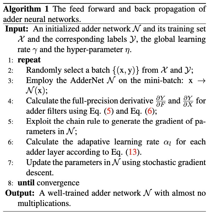 这样可以保证每层更新的幅度一致,最终AdderNet的训练过程表述为: