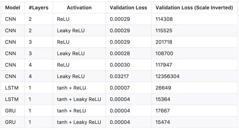 上表中的每一行都是从总共 100 个训练 epoch 中导出的最佳验证损失(validation loss)的模型。从以上结果可以看出,LeakyReLU 似乎总是比正规的 ReLU 产生更好的损失(loss)。但是,使用 Leaky ReLU 作为激活函数的 4 层 CNN 会造成较大的验证损失。这可能是由于模型的错误部署造成的,对此可能需要进行重新的验证(re-validation)。CNN 模型可以训练得非常快(用 GPU,2 秒 /epoch),性能比 LSTM 和 GRU 稍差。 最好的模式似乎是 LSTM tanh 和 Leaky ReLU 作为激活函数,虽然 3 层 CNN 似乎能更好地捕捉局部临时的数据依赖性。