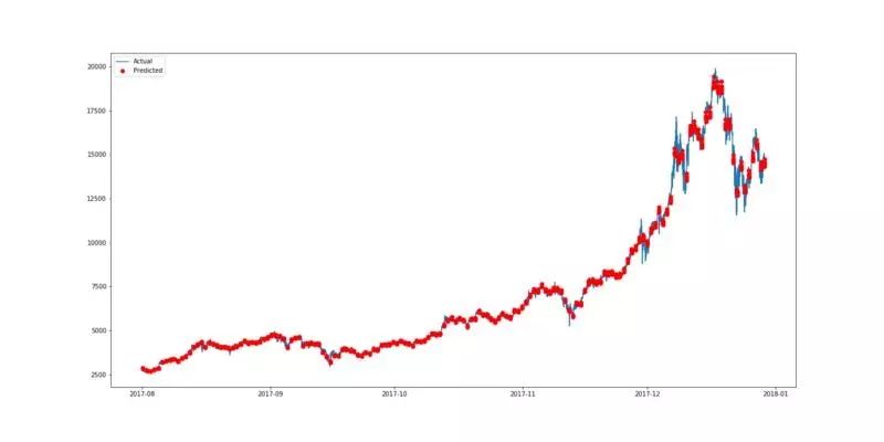 用 pyplot 来绘制图形。由于预测价格是基于每 16 分钟的基础上,所以将这些点分散会使我们更容易查看结果。因此,这里预测的数据被绘制为红点,如第三行中的“ro”所示。下图中的蓝线表示市场的真实情况(实际数据),而红点表示预测的比特币价格。