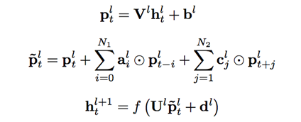 对cFSMN进一步改进,我们得到了深度前馈序列记忆网络(DFSMN)。DFSMN利用了在各类深度神经网络中被广泛使用的跳跃连接(skip-connections)技术,使得执行反向传播算法的时候,梯度可以绕过非线性变换,即使堆叠了更多DFSMN层,网络也能快速且正确地收敛。对于DFSMN模型,增加深度的好处有两个方面。一方面,更深的网络一般来说具有更强的表征能力,另一方面,增加深度可以间接地增大DFSMN模型预测当前帧的输出时可以利用的上下文长度,这在直观上非常有利于捕捉序列的长程信息。具体来说,我们把跳跃连接添加到了相邻两层的记忆模块之间,如下面公式所示。由于DFSMN各层的记忆模块的维数相同,跳跃连接可由恒等变换实现。