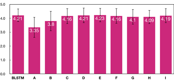 所有的DFSMN模型均由底层的若干DFSMN层和上的2个全连接层组成,每个DFSMN层包含2048个结点和512个投影结点,而每个全连接层包含2048个结点。在上图中,第三列表示该模型由几层DFSMN层和几层全连接层组成,第四列表示该模型DFSMN层的记忆模块的阶数和步长。由于这是FSMN这一类模型首次应用在语音合成任务中,因此我们的实验从一个深度浅且阶数小的模型,即模型A开始(注意只有模型A的步长为1,因为我们发现步长为2始终稍好于步长为1的相应模型)。从系统A到系统D,我们在固定DFSMN层数为3的同时逐渐增加阶数。从系统D到系统F,我们在固定阶数和步长为10,10,2,2的同时逐渐增加层数。从系统F到系统I,我们固定DFSMN层数为10并再次逐渐增加阶数。在上述一系列实验中,随着DFSMN模型深度和阶数的增加,客观指标逐渐降低(越低越好),这一趋势非常明显,且系统H的客观指标超过了BLSTM基线。