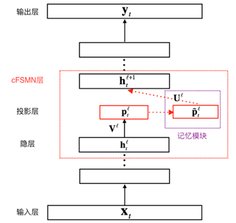 紧凑前馈序列记忆网络(cFSMN)作为标准的前馈序列记忆网络(FSMN)的改进版本,在网络结构中引入了低秩矩阵分解,这种改进简化了FSMN,减少了模型的参数量,并加速了模型的训练和预测过程。
