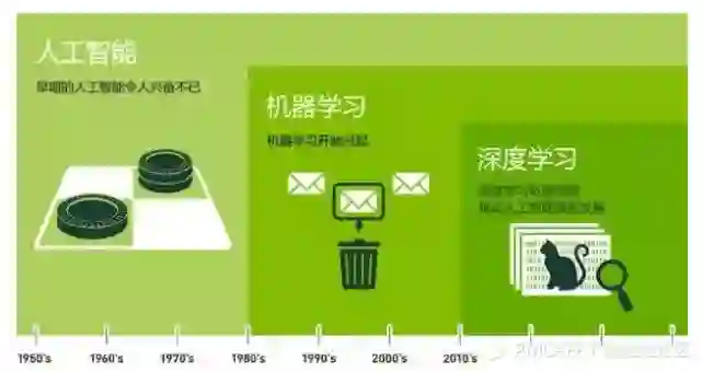 这三个概念是包含关系,人工智能包含机器学习,机器学习包含深度学习,从20世纪50年代开始,随着算法的演化,数据的完善,算力的提升,逐步演化出来,如下图所示: