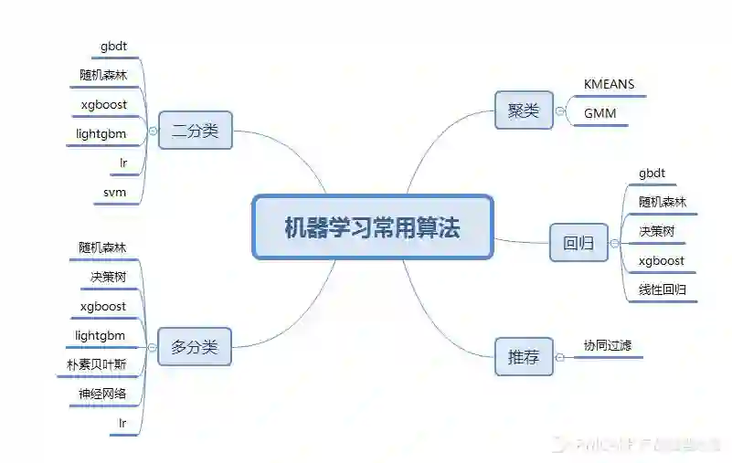 如果只是上文中所说,我们要了解一些常用的算法,机器学习中的算法可以分为几大类,分类算法(二分类和多分类),回归算法,聚类算法,时间序列算法,推荐算法,具体常用算法如下图所示,至于算法的概念大家可以google查询算法详情,这里不再赘述。