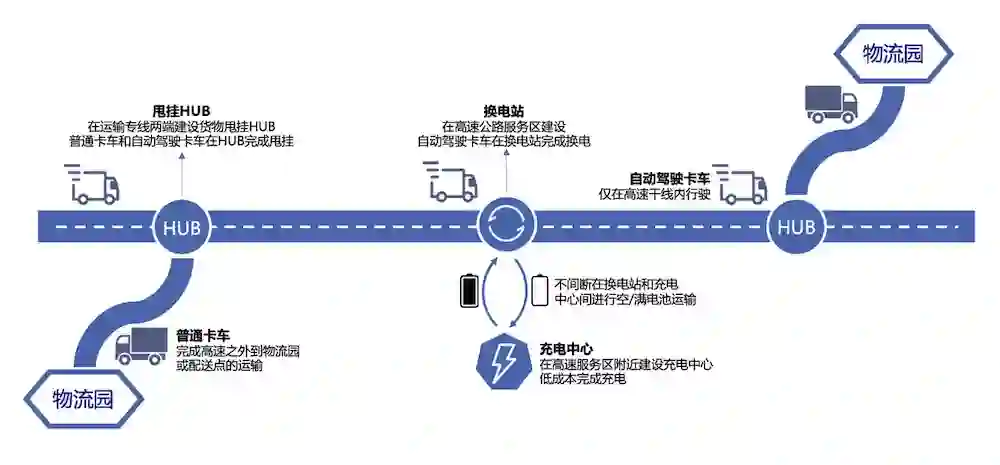 H2H(Hub to Hub)干线物流模式,通过货箱与车头分离的运输方案,将高速路段的驾驶任务交给 DeepWay 自动驾驶牵引车头