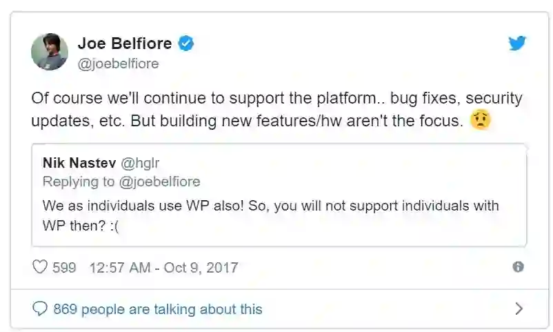 早在 2017 年 10 月,Windows 10 Mobile 官方发言人 Joe Belfiore 在 Twitter 宣布 Windows 10 Mobile 移动操作系统的未来动态,新功能和新硬件不是微软重点,但仍会有修复和安全补丁(即进入维护状态),继续支持企业用户。