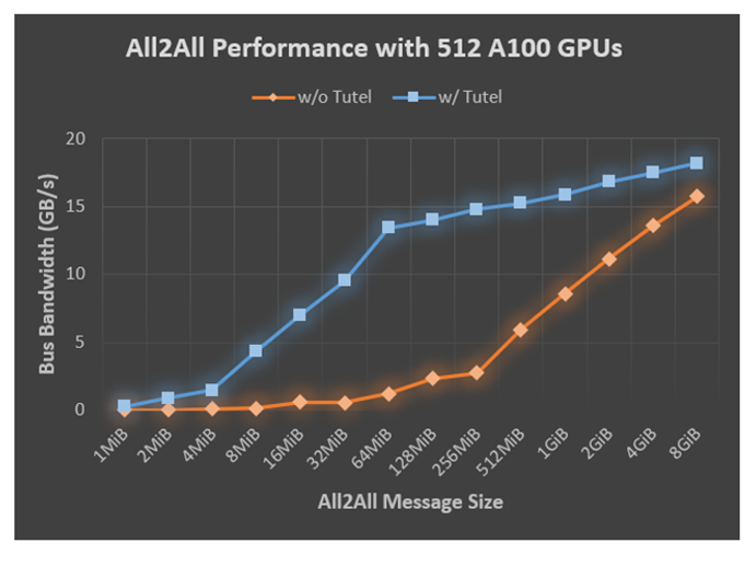 Tutel 提高了小消息组的通信效率,并在 NDv4 系统上提供了高性能的 all-to-all 通信。