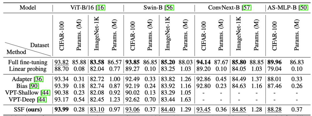 研究者分别在 FGVC、VTAB、CIFAR-100 和 ImageNet-1K 进行了实验,如表一、二、三。SSF 一致性地超过了其他高效微调方法(Adapter、Bias 和 VPT)。在表三中,SSF 在 Swin Transformer、ConvNext 和 AS-MLP 等各种模型上的结果也始终优于其他参数高效微调方法,这也验证了 SSF 在多种模型上的有效性。更多的分析见论文。