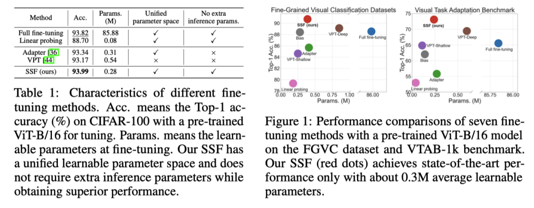 图一:SSF 方法的特点以及它在 FGVC 和 VTAB 任务上的性能。