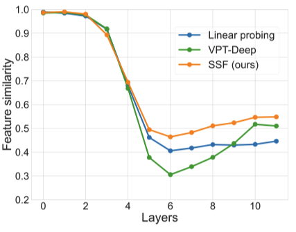图三:完全微调和微调头部层、完全微调和 VPT-Deep、完全微调和 SSF 在 ViT-B/16 的不同层中的特征相似性的可视化。