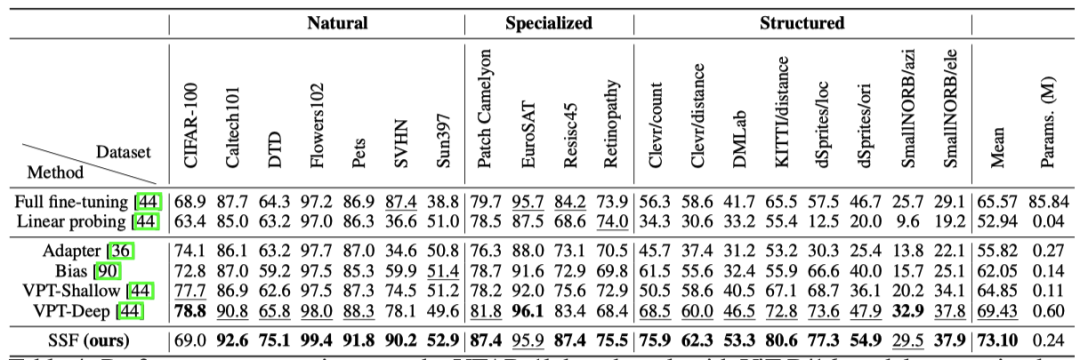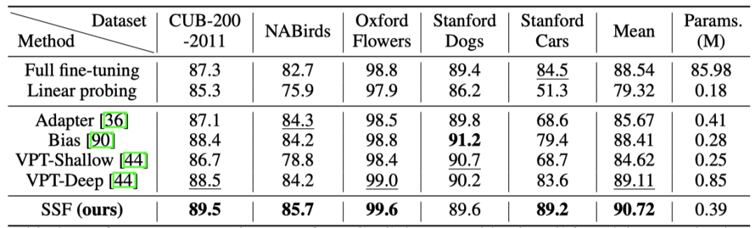 通过在 26 个分类数据集和 3 个鲁棒性数据集上评估 SSF 方法,结果显示:与其他参数高效的微调方法相比,SSF 获得了最先进的性能。