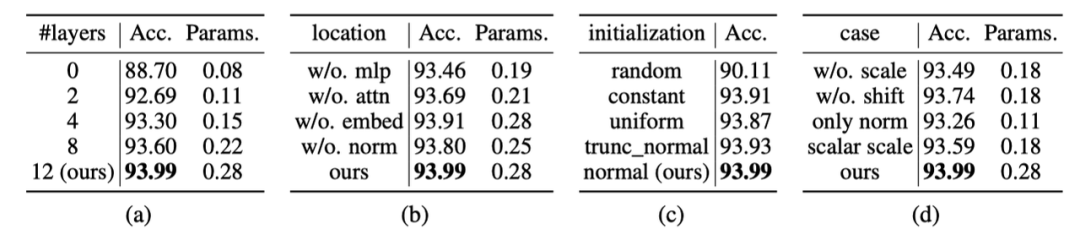 表四:不同设计的影响。(a) 层数的影响 (b) 不同插入位置的影响 (c) 初始化的影响 (d) 不同组件的影响