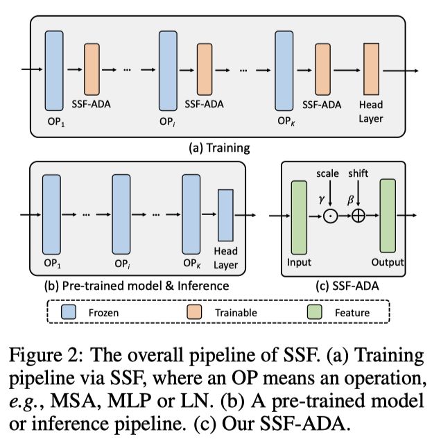 SSF 的设计:SSF 执行线性转换来调节特征来进行参数高效的微调,如图二所示。在图二(a)中,给定一个在上游任务中预训练的模型,研究者在网络的每个操作(OP)之后插入 SSF-ADA (把提出的方法称为 SSF,把具体的模块称为 SSF-ADA)来调节特征。总共有 K 个操作,这些操作可能包含多头自注意力(MSA)、MLP 和层归一化化(LN)等等。在微调过程中,这些操作中的预训练权重保持冻结,SSF-ADA 参数保持更新。具体的 SSF-ADA 结构如图二 (c) 所示,前一个操作输出的特征用一个缩放因子进行点乘,然后用一个移位因子求和,这与输入无关,如下所示