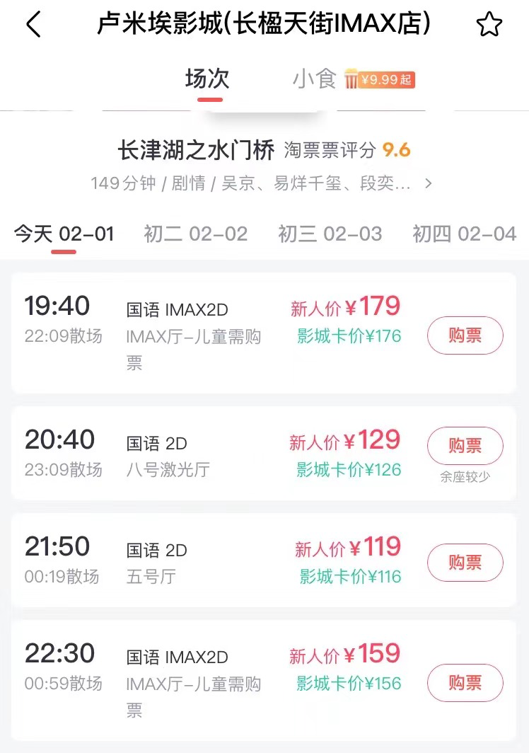 据猫眼专业版统计,2022年大年初一,全国平均票价高达58.7元,比2021年40.3元的全年平均票价,增长了45.6%。根据淘票票APP上的记录,在北京、上海等一线城市的影院,单场IMAX 2D厅黄金档票价甚至达到了179元,在中部地级市影院,场均也不低于50元。有业内人士表示,今年春节档票价,是自2018年春节档以来涨幅最大的一次。