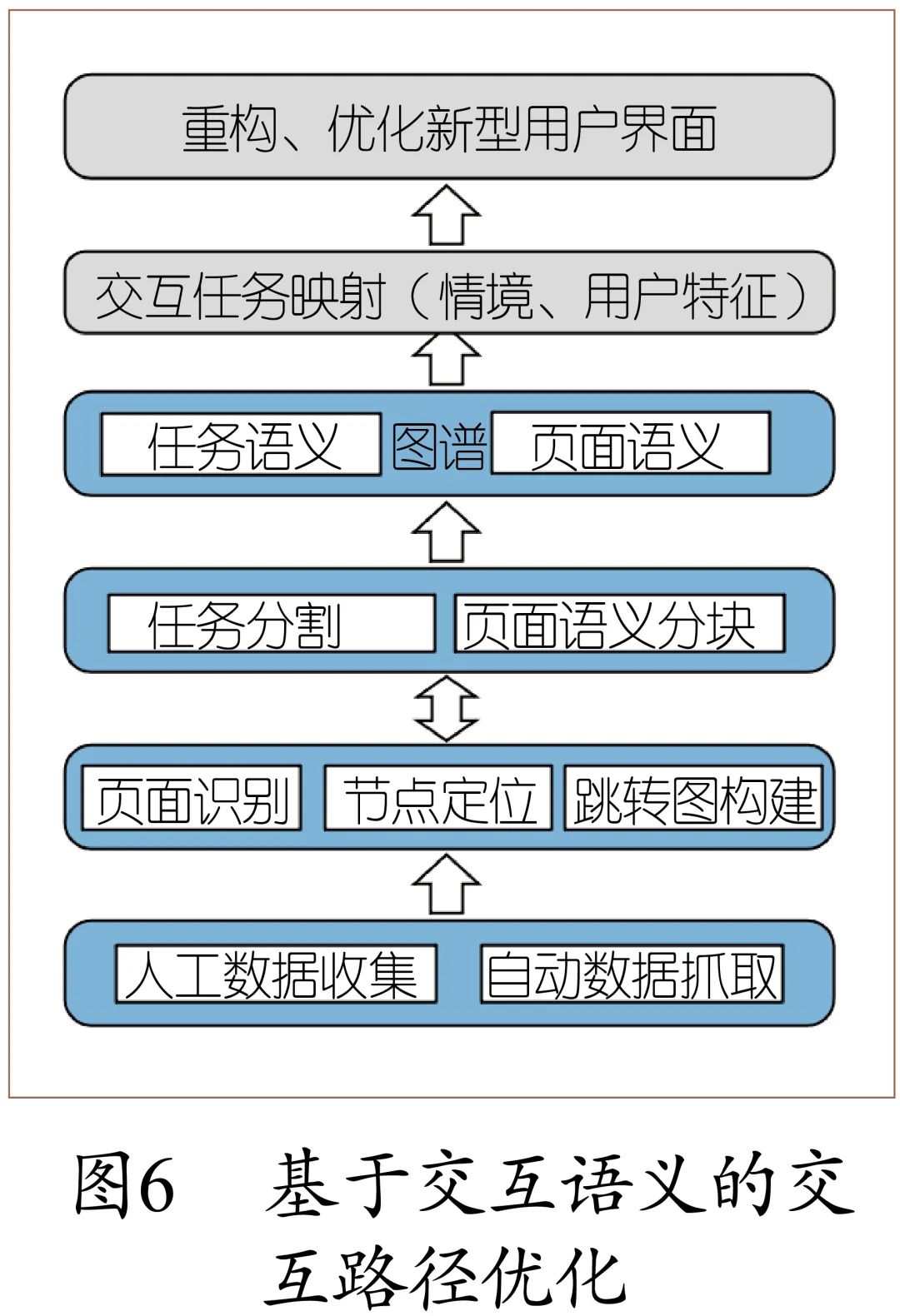 基于交互语义集合,对交互任务进行拆分和信息量化,根据任务情境、用户特征,采用模态替换(比如盲人只能听和摸、普通人开车时注意力和操作范围的变化等)和互补方法,完成多模态输入交互语义集合的构建和灵活切换,面向用户当前交互任务,实现快捷路径生成和低效路径剪枝,整体上优化用户信息交互效率,如图6的上面两层。