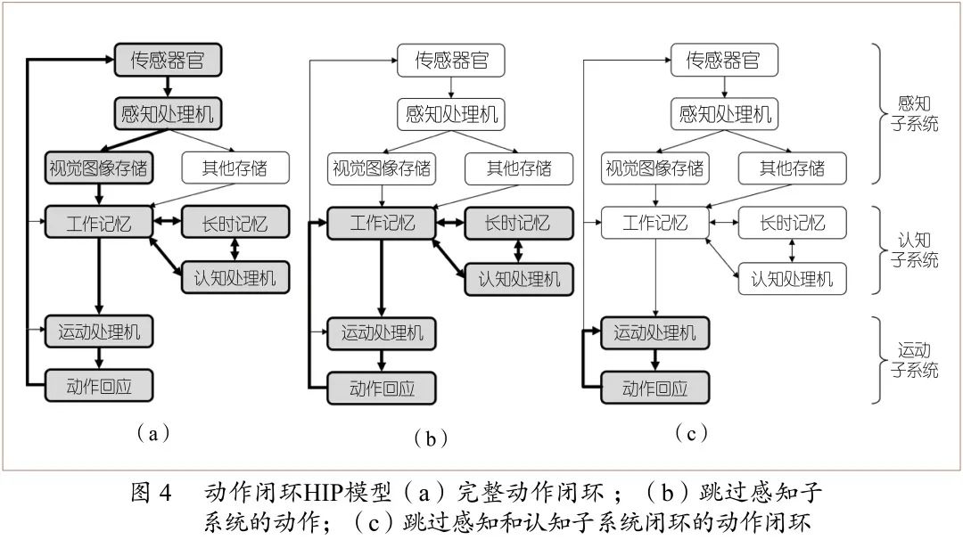 如图4(a)所示,一个完整的动作闭环会经历感知、认知和运动三个子系统对应的信息处理阶段,其中运动子系统的信息来源一般依赖于认知子系统,认知子系统的信息来源一般依赖于感知子系统。同时,人体在做出动作回应后,一般会重新回到下一个动作闭环的感知阶段,形成一个完整的闭环。