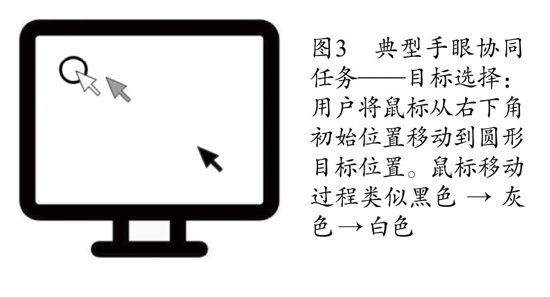 其中a、b是与输入设备(如点选面板、鼠标、触摸板、触屏等)有关的常量,D为目标对象的大小,S为从当前位置到目标对象的距离,是变量。公式(1)看似简单,但在实现技术上,由于人的手眼协调性(如图3所示)、手运动的(一般会遵循粗粒度到细粒度的原则移动)控制平面与眼睛看的(视线移动)显示空间的映射关系(称为C/D Ratio)、软件对输入设备信号的处理、软件对界面元素分布的感知等可变因素,建立特定的费茨定理公式,并提供高拟合度的鼠标或触控输入技术、界面布局和动态优化技术,成为决定GUI产品用户体验优劣的关键技术(在同样的交互任务上,不同的技术实现,效率可能有数倍的差异),往往还有专利保护的技术。理解、分析费茨定理及其作用,进行数据采集和回归实验,讨论优化方案,也一直是我所讲授的人机交互课程的重要内容,学生通过实验体会到,好的人机交互技术,其内在算法能很好地与人的运动感知认知能力相融,用户的体验反而是无感的,即所谓的用而不觉。