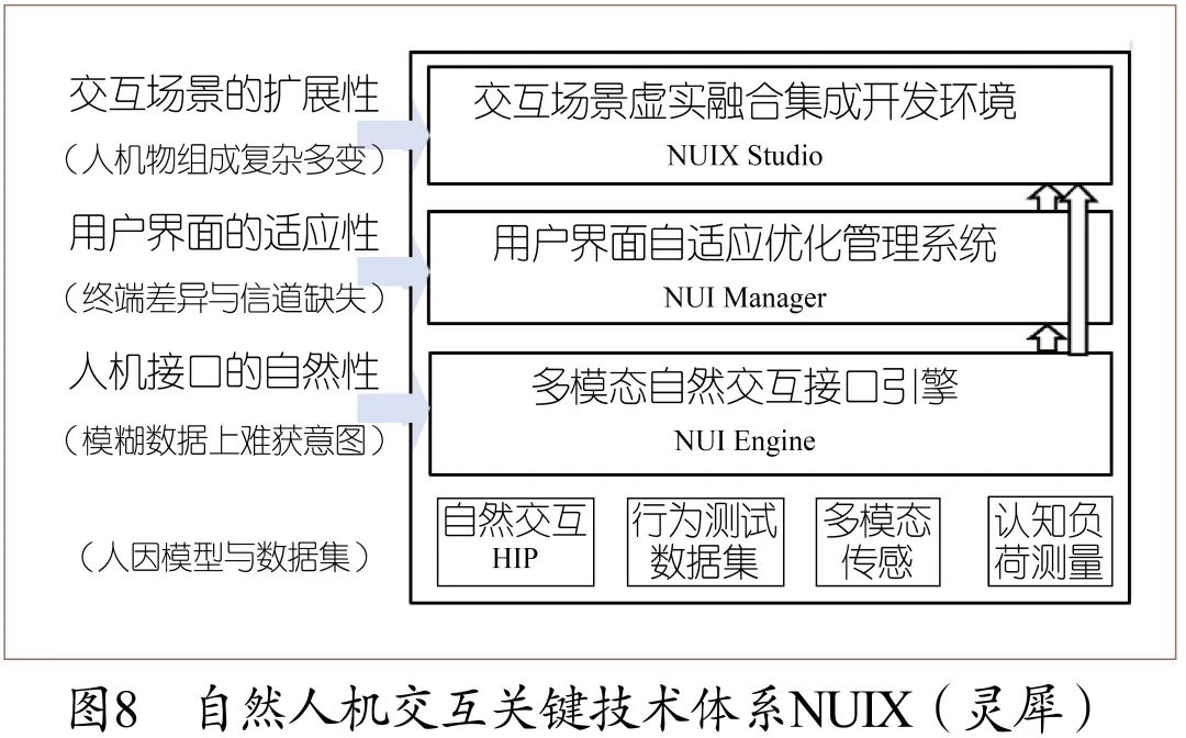 我长期在人机交互领域做研究实践,基于上述4个层面的系统性研究成果并逐渐形成如图8所示的自然人机交互关键技术体系NUIX(灵犀),并在教研实践中不断更新。