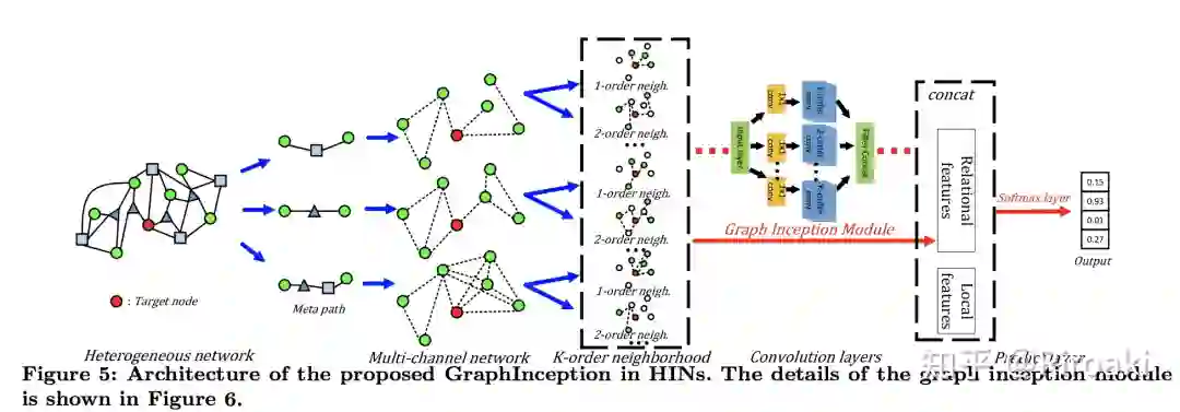 GraphInception在传播过程中引入元路径(meta-path)来处理异构图的关系分类问题。元路径是指任意一条包含边类型(或者,在知识图谱中是关系类型)序列的路径,这条路径的长度为其连接的节点个数。有了元路径,我们就可以根据节点的边类型和距离将邻居节点分类,如此就可以将异构图分解为一个同构图的集合(这也被称为多通道网络)。形式上,有了元路径的集合 ,一个异构图可以转化为如下的多通道网络: