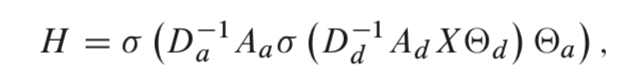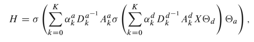 其中 是邻接矩阵中包含父节点传播 步的子矩阵,而 是邻接矩阵中包含子节点传播 步的子矩阵,而 则为对应的度矩阵。