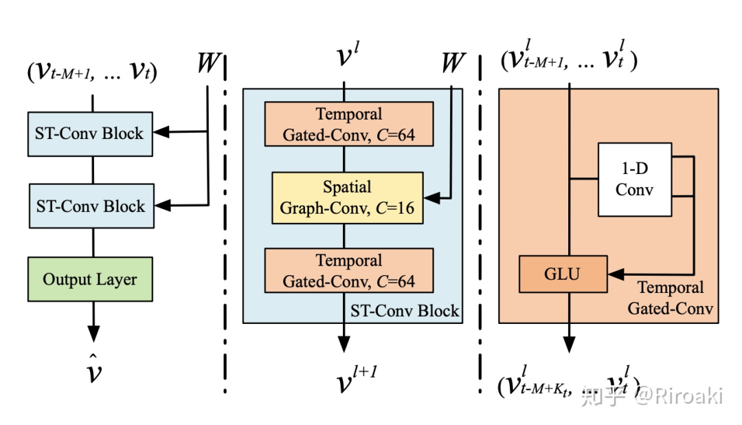 STGCN包含多个空间-时序卷积块,每一个卷积块中使用两个时序门控卷积层(temporal gated convolutional layer)和一个空间图卷积层(spatial graph convolutional layer)夹在其中。在层内部还使用了残差连接和瓶颈策略(bottleneck strategy),如下图: