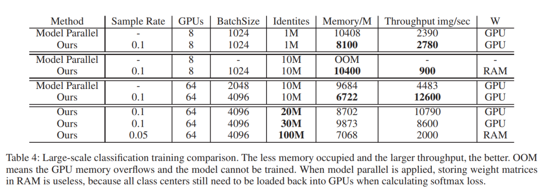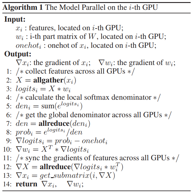 在没有使用并行模型的情况下,训练具有大量身份的模型比较困难,这受制于单一显卡的内存容量。softmax权重 矩阵存储存在瓶颈。打破瓶颈的一种最为直接的方法是将W划分为k个子矩阵w;因此,为了计算最终的softmax输出,每个GPU必须从所有其他GPU收集权重,因为权重在不同的GPU之间被分割。