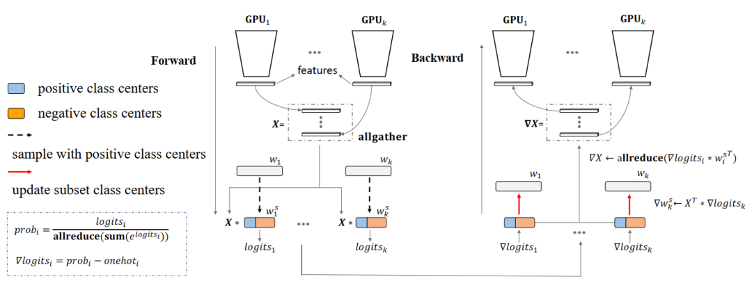 在模型并行的情况下,为了平衡每个GPU的计算和存储,每个GPU上采样的类中心数应该相等,因此采样过程改变如下: