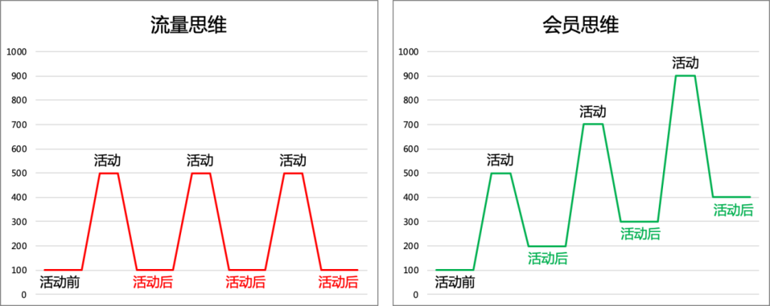 流量思维,活动结束后业绩没有增长;会员思维,活动结束后业绩增长