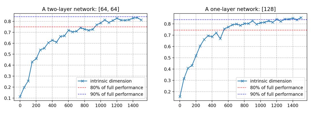 在内在维度度量的背后有一个直觉,那就是,因为参数空间具有这么高的维度,那么,利用所有维度来有效地学习有可能是不必要的。如果,我们只通过一片目标景观仍能学习一个好的解决方案,那么,所得的模型复杂性可能比通过参数计数所显示的复杂性更低。这本质上是内在维度试图评估的内容。
