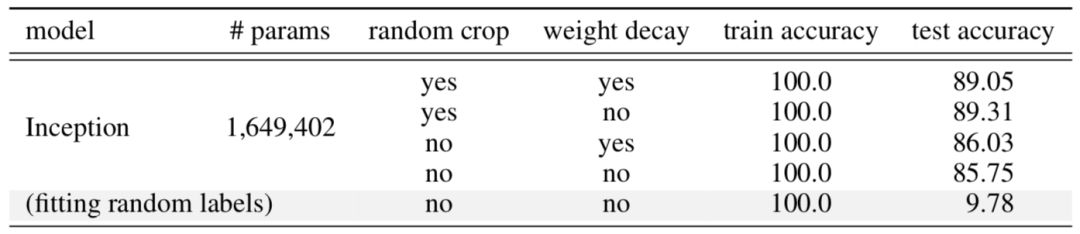 以在 CIFAR10 上训练的 Inception 模型为例(请参看图 5),正则化技术有助于样本外泛化,但不多。没有单一的正则化看起来是独立于其他项的关键。因此,正则化器不太可能是泛化的根本原因。