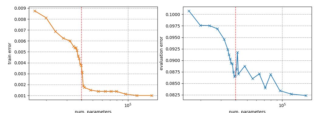 我没有为了获得完美的训练性能而对每个模型进行足够长时间的训练或调整,但是,评估误差的确显示在插值阈值周围有特别的扭曲,与训练误差不同。例如,对于 NMIST,阈值是训练样本的数量与类(10)的数量的乘积,即 4 万。