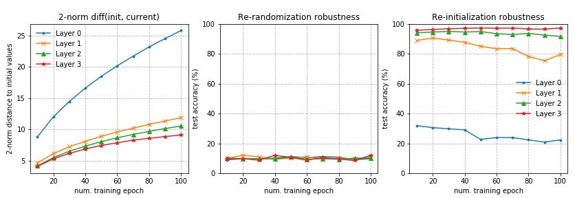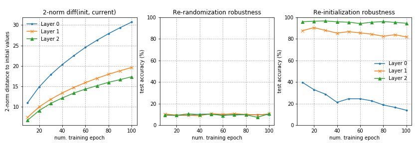 在全连接和卷积网络中可以观察到类似的模式。任何层的重新随机化完全破坏了模型的性能,因为预测马上变成了随机猜测。更有趣和令人惊讶的是,当应用重新初始化时,只有第一层或最前面的几层(那些最接近输入层的)至关重要,而重新初始化更高层不会导致性能下降。