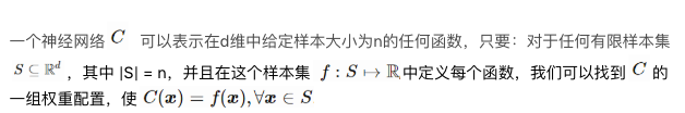 到目前为止,我们讨论的通用逼近定理不考虑有限样本集。Zhang 和其他人(2017) 提供了一个在双层神经网络上有限样本表达性的简洁证明。