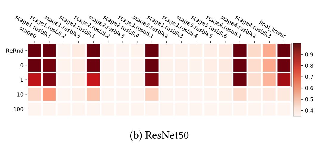 图 10。在 CIFAR10 上训练的 ResNet-50 模型的层重新随机化(第一行)和重新初始化(重置行)的稳定性。(图的来源:原始论文)
