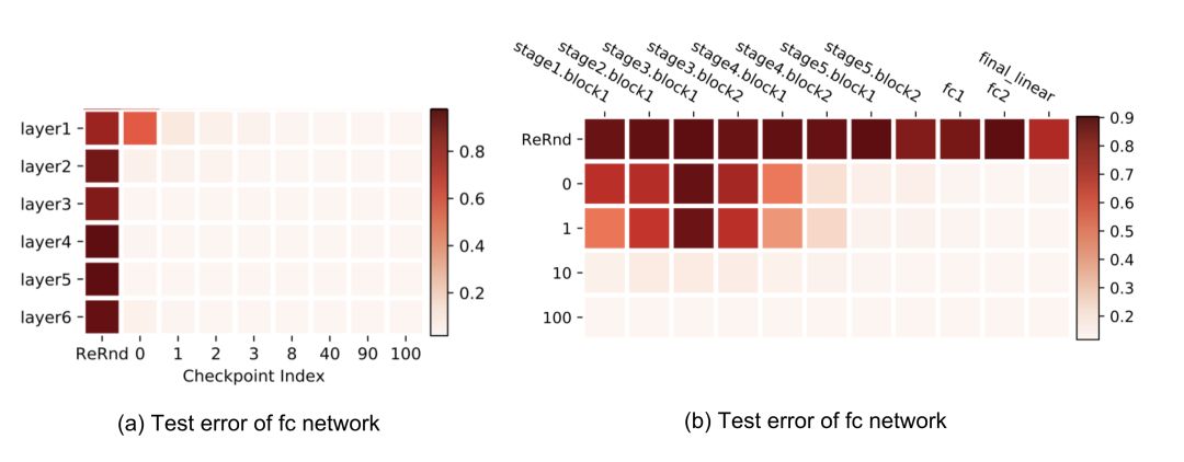 图 9。(a)在 MNIST 上训练的 fc 网络。每一行对应网络中的一层。第一列是每一层的重新随机化稳健性,其余的列表示在不同训练时间的重新初始化稳健性。(b)在 CIFAR 10 上训练的 VGG11 模型(卷积网络)。与(a)中的表示类似,但是,行和列被转置。(图的来源:原始论文)