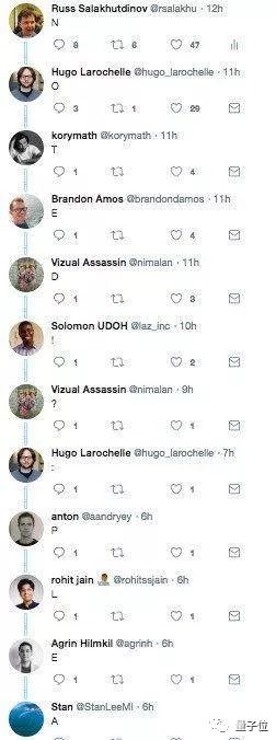 包括谷歌大脑科学家&谢尔布鲁克大学教授Hugo Larochelle、谷歌大脑学生研究员Kory Mathewson、CMU博士&OpenFace作者Brandon Amos在内的多位研究人员都一本正经的参与到了这一“密码接龙”中,仿佛有什么大事要发生。