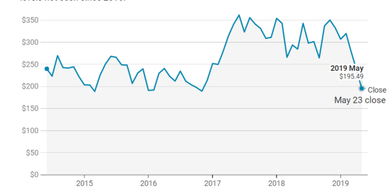 5 月 23 日纳斯达克股市收盘后,特斯拉股价报 195.49 美元,正式跌破 200 美元整数关口。随着美国对电动车的补贴逐步减少,且更多有竞争力的车企进入 EV领域,投资者担心特斯拉的盈利能力无法持续,股价一路低迷,今年已累计下跌了 43%,创 2016 年 12 月以来新低。摩根斯坦利分析师 Adam Jonas 曾是特斯拉的坚定看多者,最近也变得悲观起来,他在一个投资者电话会议上表示,特斯拉不再是一个高增长的企业,负债太高,需要通过不断重组来维持。一年前,他认为特斯拉股价将高达每股 379 美元,现在他画风突变,觉得最坏的情况下股价可能跌到只剩下 10 美元。
