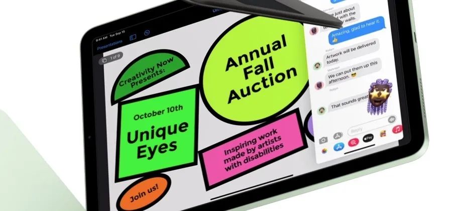 其中,新款的iPad Air 4更新了外观设计,采用 10.9 英寸的 Liquid Retina 屏幕,全面屏设计。分辨率为 2360 x 1640。将 Touch ID 首次整合到顶部的电源键上,首发 A14 仿生芯片,采用 USB-C 接口。