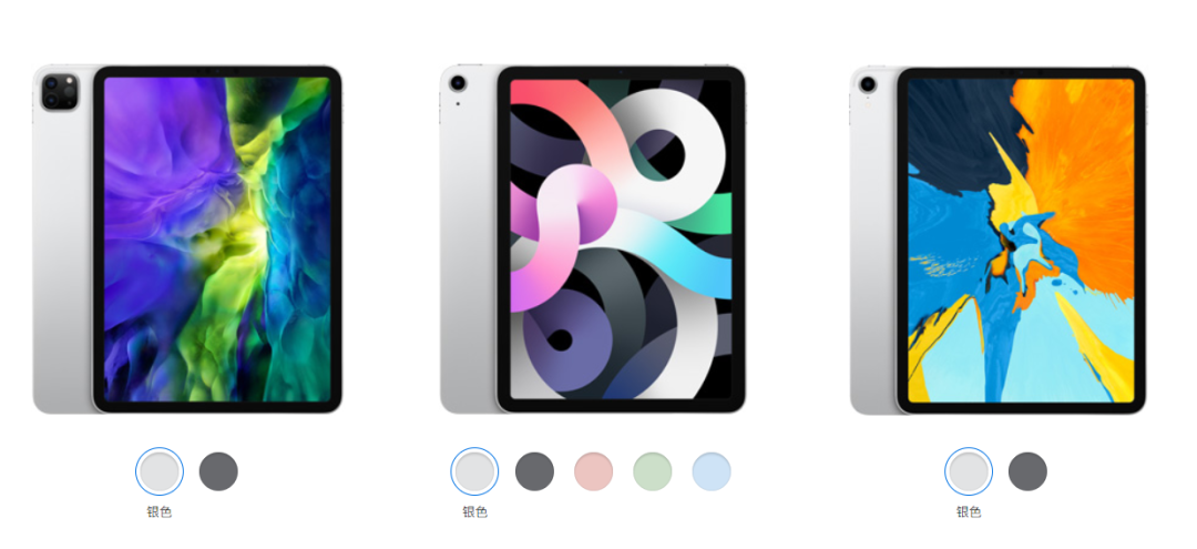 配色方面,Pro只有两种颜色:银色和深空灰色,而iPad Air4这次除了有银色和深空灰色,还有玫瑰金、绿色和天蓝色。