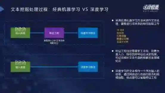 经典机器学习的很多算法需要比较强的数学功底,通过数学公式做出优美完整的论证。但现在经典机器学习算法的收益已经没有以前大了。原因如下图所示,图中列出了文本挖掘领域中,经典的机器学习和深度学习的对比。