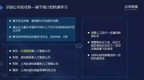 更高级的是基于统计机器学习的方法,从算法上来说是用序列标注的方式来做。这种方法要求我们标注数据,例如上图中我们标注了一句话:“达观数据是人工智能公司”。现在它会预测“上海的虚拟数据”中的“虚拟数据”也是一家公司。它是怎么做到的?后文会详细介绍。这种做法就跟模板匹配完全不一样了。在图中,可能第一个预测“虚拟数据是人工智能公司”还有模板的性质,但后面两个表述和前面完全不同,所以这种基于统计机器学习的方式有了一定的预测能力。