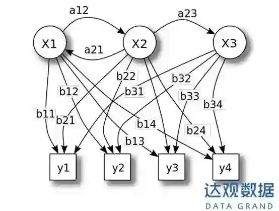 上图中“他来自达观数据”,就是我们人看得到的观察序列,但它背后隐藏了分词。“他”是一个词,“来自”是一个词,“达观数据”是一个词,这个是我们说“隐藏序列”,没有写到明面上,但需要我们模型预测。怎么预测?下图画了预测模型的示意图。图中,X_1、X_2、X_3就是我们说的隐藏内容,人能看到的是y_1、y_2、y_3、y_4,也就是观察序列。但其实不同状态是可以不停地转换的。比如X_1到X_2之间有一条连线说明X_1和X_2之间可以通过概率a_12做转换;X_2到X_3之间通过概率a_23做转换。所以这个模型其实比链式的HMM还要更复杂一点,因为它有X_2到X_1这样的转换。所有的X都可以转换到y_1、y_2、y_3、y_4这样的观察序列,每对转换关系都有对应的概率。